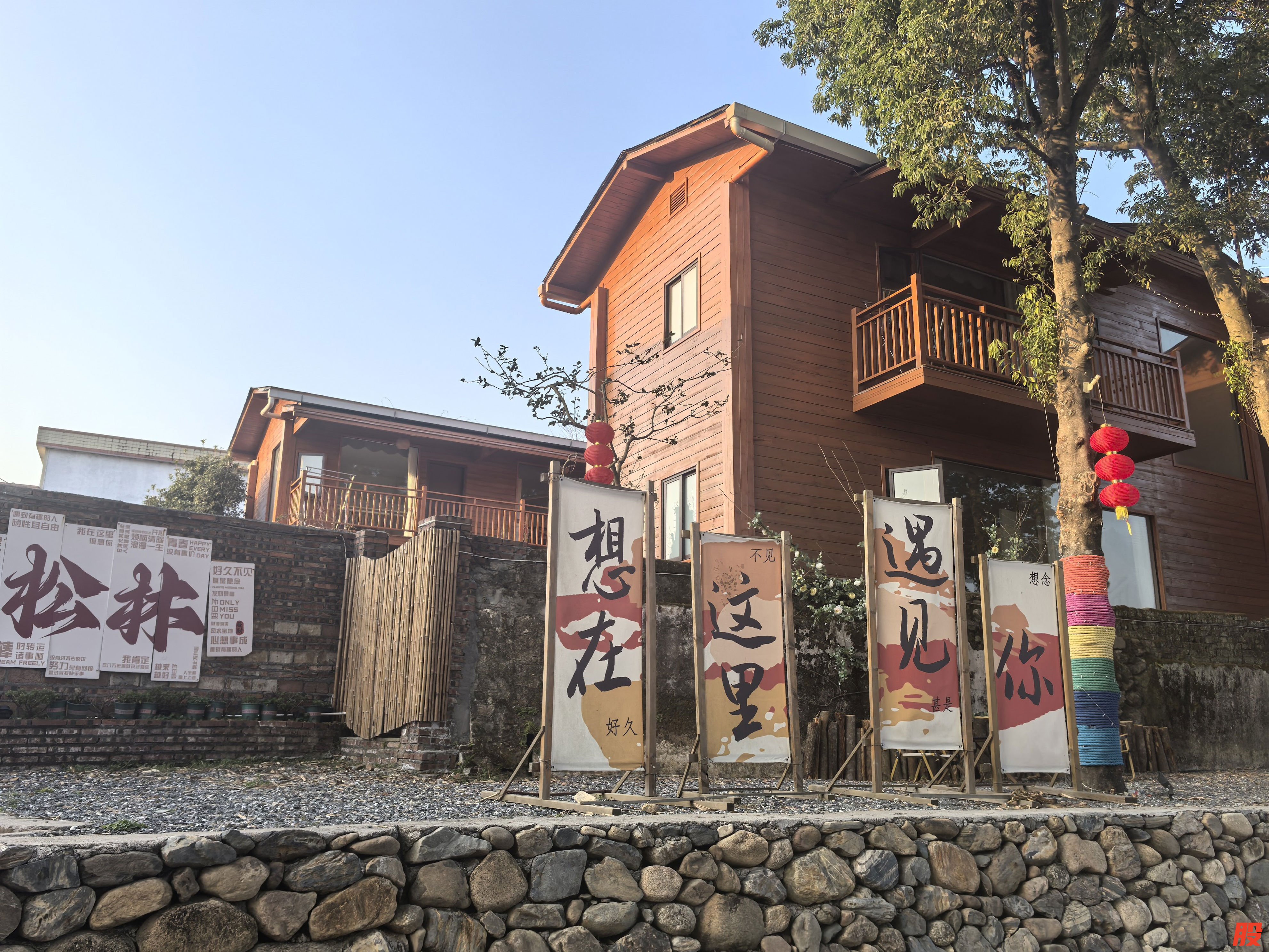 走进松林村,清澈溪流穿村而过,8栋错落有致的木屋别墅掩映在翠竹山林间,汤泉泡池、牛栏咖啡厅、松果餐厅等配套设施一应俱全。村子里随处可见可爱的墙绘、有趣的标语、小巧的书吧。门前是西洋菜基地,田埂上灯笼飘荡,木板路直通到小河边。而清澈见底的河水中倒映着夕阳,河滩上架着帐篷,对着青山品香茗,也不失为赏心乐事,怪不得那么多驴友视这里为世外桃源般的休闲胜地。