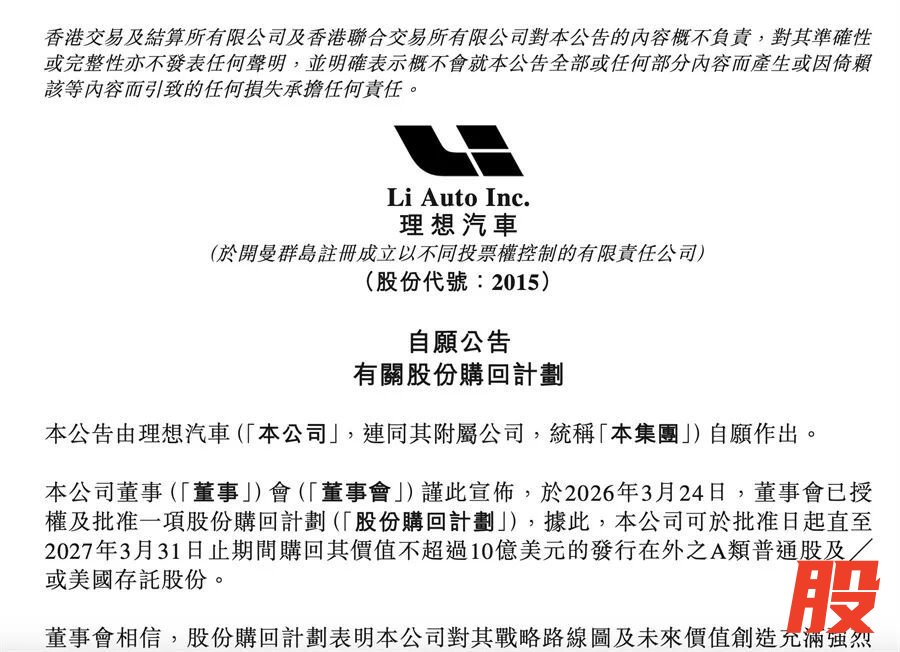 【文/财圈社&道哥说车 麻建宇】3月24日晚,理想汽车公告称,董事会已批准一项股份回购计划,公司获授权在批准日期起至3月31日期间,购买最高10亿美元的A类普通股和/或美国存托股。值得一提的是,这是理想汽车自2020年赴美上市以来首次实施股份回购。